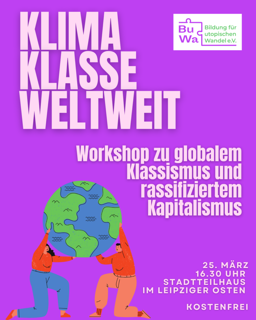 Wie sind die Folgen der Klimakrise zwischen Arm und Reich global verteilt? Was ist Klima-Klassismus? Wie hängen Rohstofflieferketten mit rassifiziertem Kapitalismus (= Untrennbarkeit von Rassismus und Kapitalismus) zusammen? Wie können wir solidarisch gegen weltweite Ausbeutung und ökologischen Kollaps kämpfen? Zu diesen Fragen wollen wir im Workshop gemeinsam mit dir lernen, nachdenken und diskutieren. Du brauchst kein Vorwissen.